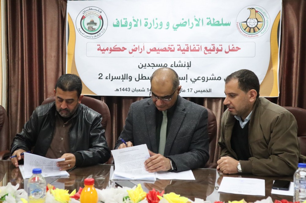 وقعت وزارة الأوقاف والشؤون الدينية وسلطة الأراضي، اليوم الخميس، اتفاقية تقضي بتخصيص أراضٍ حكومية لإنشاء مسجدين في مشروع إسكان القسطل والإسراء2.
