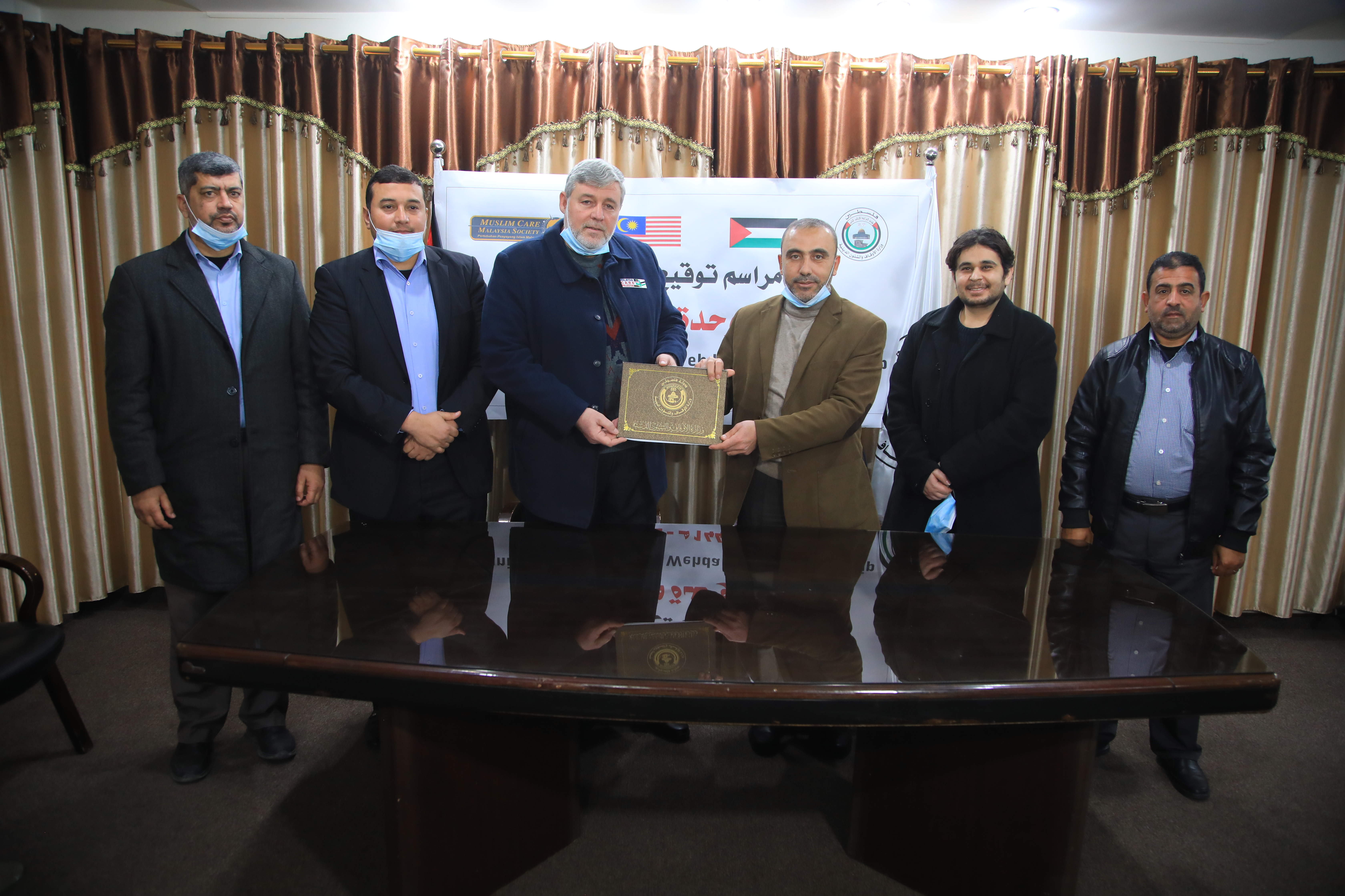 وقع وكيل وزارة الأوقاف والشؤون الدينية د. عبد الهادي الأغا مع ممثل مؤسسة مسلم كير ماليزيا في فلسطين أ. أحمد النجار مذكرة تفاهم لإنشاء وقفية الوحدة في قطاع غزة بتكلفة 205.550 دولار.