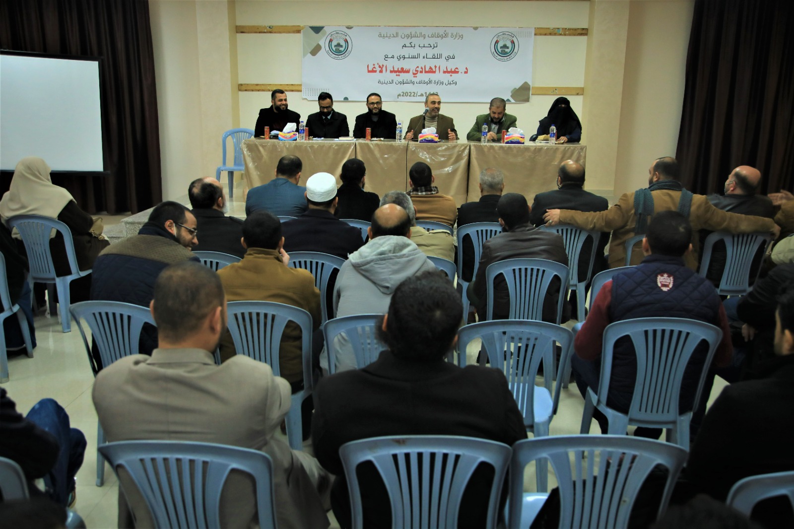 نظمت وزارة الأوقاف والشؤون الدينية اللقاء السنوي الخاص بموظفي التعليم الشرعي, بحضور وكيل الوزارة د. عبد الهادي الأغا, وعميد كلية الدعوة د. عبدالله أبو عليان, والنائب الأكاديمي د. أحمد مشتهي, مدير المدارس الشرعية أ. عبد السلام قوصة, ومدير الدائرة العلمية أ. أحمد أبو دلال, ولفيف من المدرسيين ومحاضري كلية الدعوة علي مستوى المحافظات.