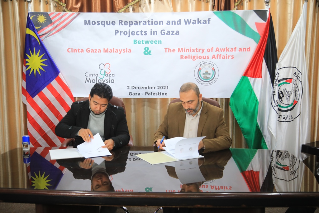 وقع وكيل وزارة الأوقاف والشؤون الدينية د. عبد الهادي الأغا مع مدير عام مؤسسة أحباء غزة ماليزيا أ. محمد قمر الزمان, مذكرة تفاهم لتنفيذ مشاريع خيرية وإغاثية ودعوية, في قطاع غزة بقيمة (500.000) دولار.