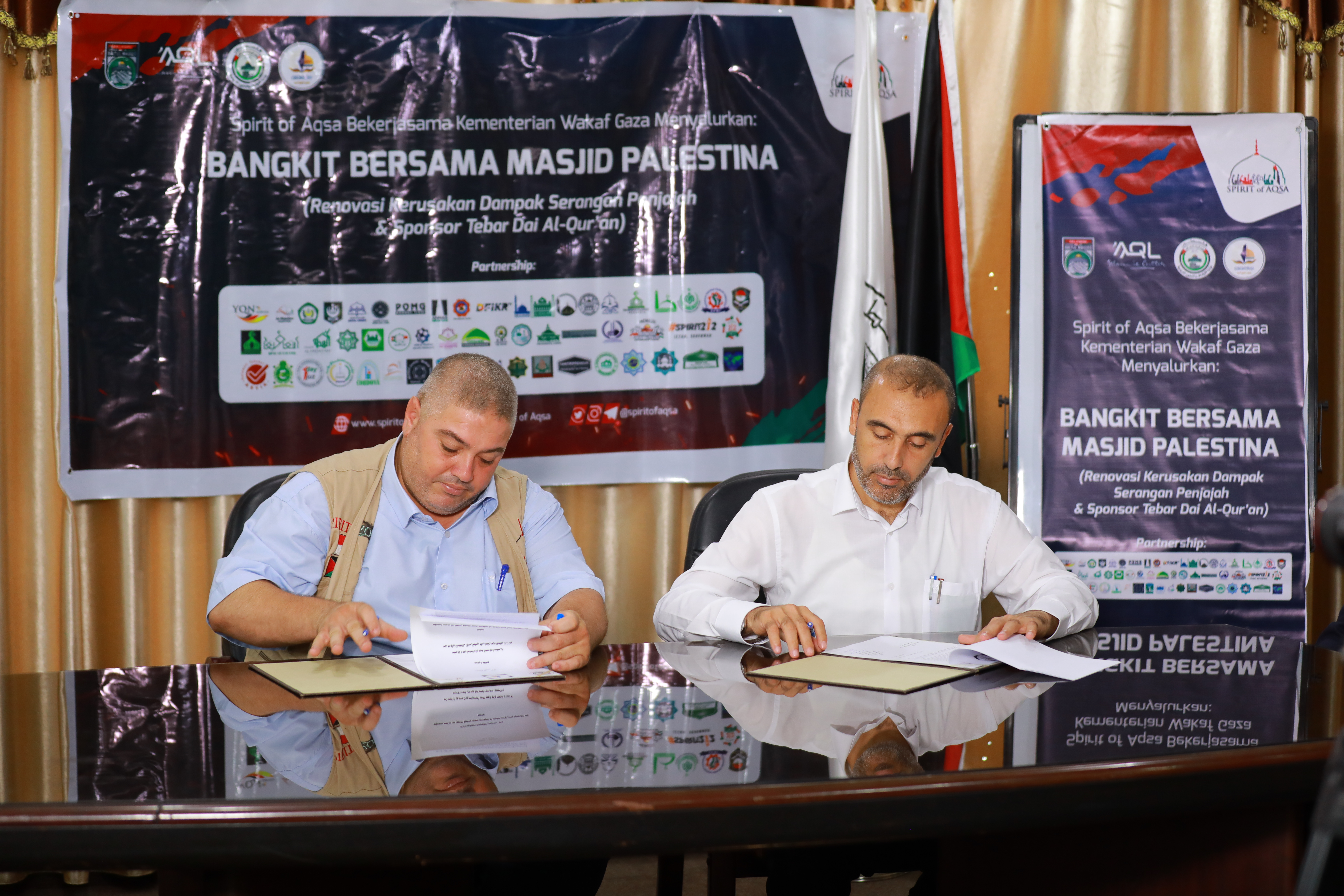 وقع وكيل وزارة الأوقاف والشؤون الدينية د. عبد الهادي الأغا مع ممثل مؤسسة سبرت اف أقصى وهيئة علماء فلسطين جنوب شرق آسيا د. عاهد أبو العطا مذكرة تفاهم لدعم الدعاة وترميم المساجد المتضررة من عدوان الاحتلال الإسرائيلي على قطاع غزة للعام 2021م, بقيمة 31000$ واحد وثلاثون ألف دولار أمريكي