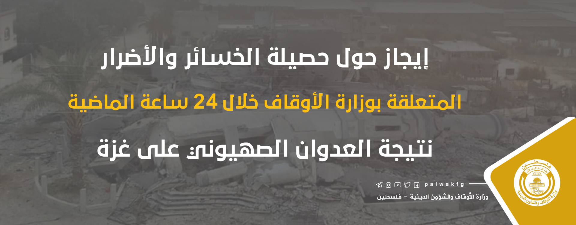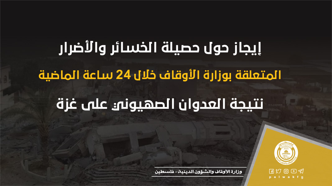 إيجاز صادر عن وزارة الأوقاف حول حصيلة الخسائر والأضرار المتعلقة في الأوقاف خلال 24 ساعة الماضية نتيجة العدوان الصهيوني على غزة