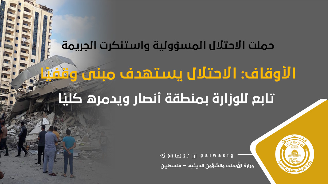 أكدت وزارة الأوقاف والشؤون الدينية أن طائرات الاحتلال الصهيوني استهدفت بشكل مباشر ومُتعمد مبنى وقفياً تابع للوزارة بمنطقة أنصار غرب مدينة غزة ودمرته بالكامل.