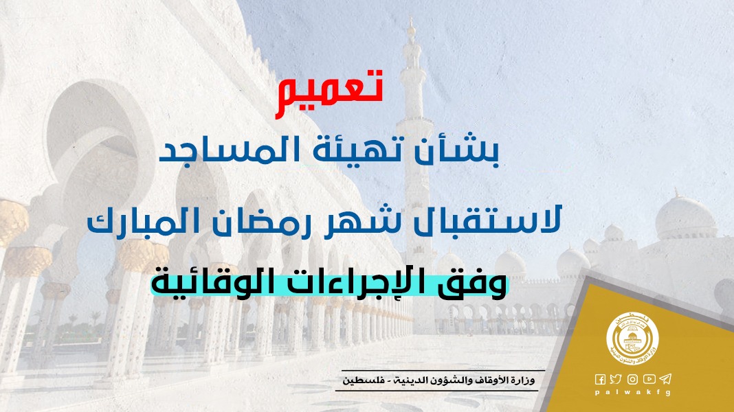 تعميم صادر عن وزارة الأوقاف والشؤون الدينية حول تهيئة المساجد لاستقبال شهر رمضان المبارك وفق الإجراءات الوقائية ▪️بداية يسعدنا في وزارة الأوقاف والشؤون الدينية أن نتقدم من أبناء شعبنا الفلسطيني والأمة العربية والإسلامية بالتهنئة القلبية الحارة بمناسبة حلول شهر رمضان المبارك سائلين المولى عز وجل أن يتقبل منا ومنكم الطاعات وصالح الأعمال.