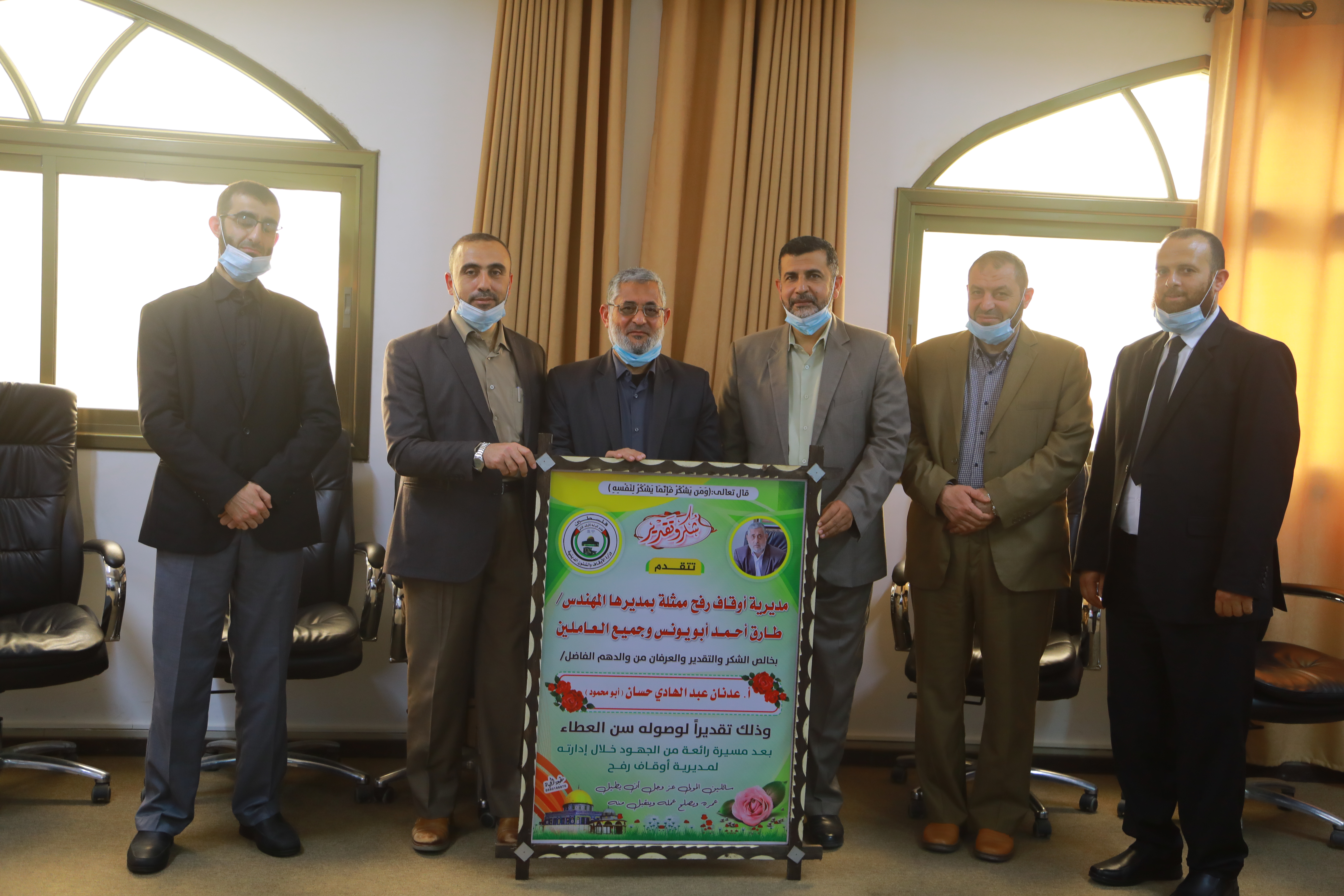 كرّم وكيل وزارة الأوقاف والشؤون الدينية د. عبد الهادي الاغا مدير أوقاف رفح أ. عدنان حسان بمناسبة انتهاء مهامه لبلوغه سن التقاعد, وذلك خلال لقاء تكريمي نظمته مديرية رفح بحضور ومشاركة مدير عام المديريات أ. منذر الغماري, ورئيس الهيئة الادارية لرفح د. خالد أبو ندى, ومدير المديريات أ. راني العدلوني ومدير أوقاف رفح الجديد م. طارق أبو يونس, ورؤساء أقسام وموظفي المديرية.