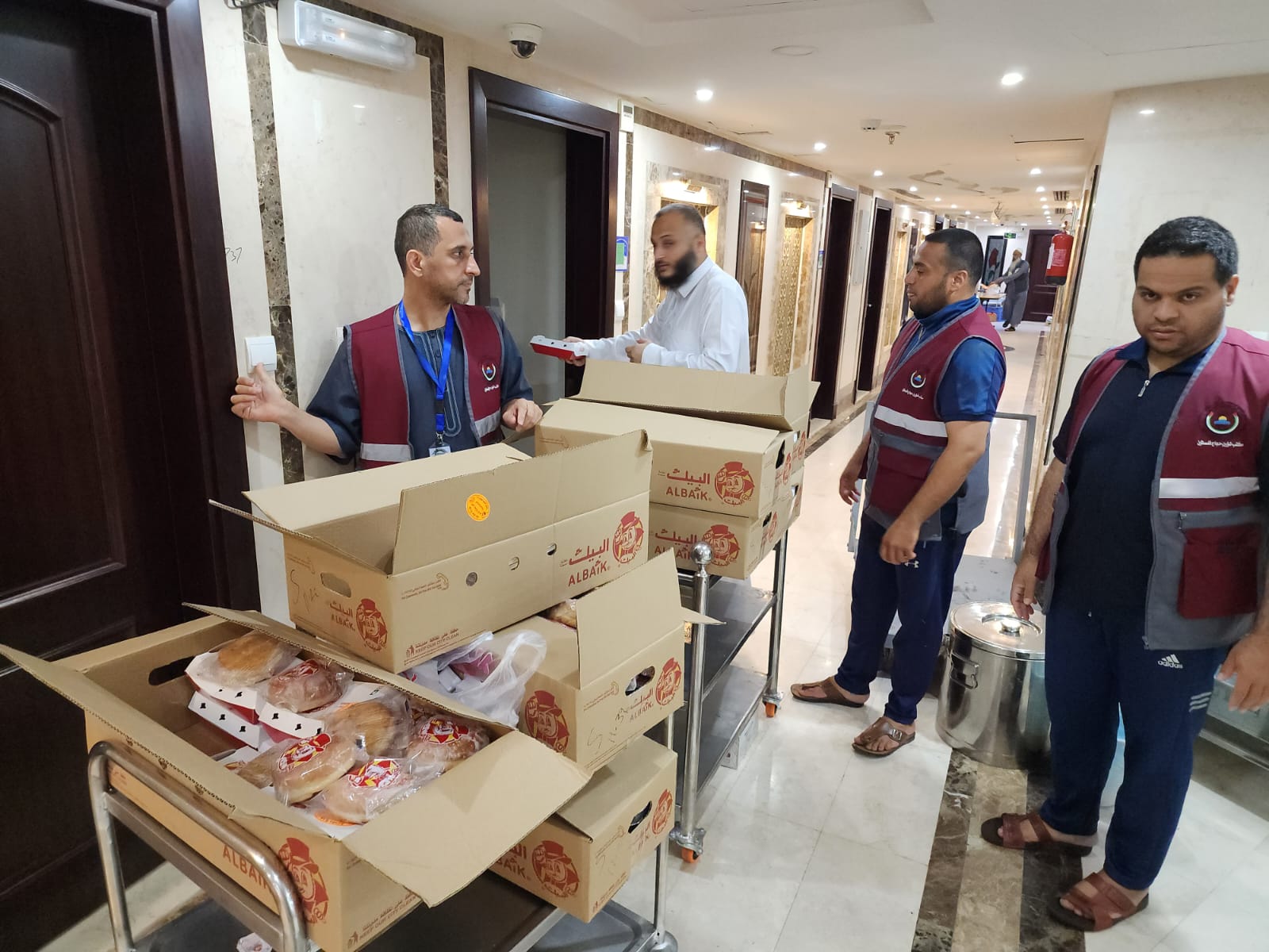 بعثة الحج الفلسطينية توزع وجبات غذائية وفواكه وألبان ومياه زمزم على حجاج القطاع