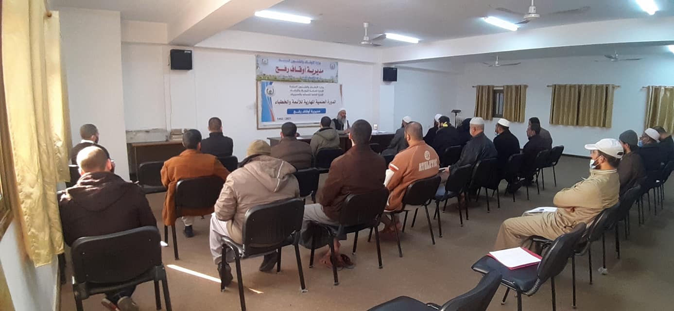 في إطار الحرص على الارتقاء بالأئمة والخطباء نظم قسمي الوعظ والإرشاد والمساجد بمديرية أوقاف رفح دورة علمية ومهارية مكثفة للأئمة والخطباء في المحافظة، تستمر ثلاثة أيام بواقع ثلاثة لقاءات يوميًا، بمشاركة 50 إمام وخطيب.