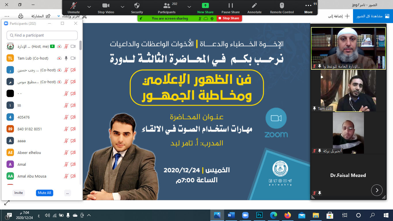 عقد قسم الوعظ والإرشاد بمديرية أوقاف غزة مجلس "سماع كتاب الأربعين النووية" عبر برنامج زوم الإلكتروني, بحضور مدير أوقاف غزة د. محمد سالم ورئيس قسم الوعظ م. محمد حسن أبو سعدة و مدرس المجلس أ. أمجد نجم, وبمشاركة أكثر من (50) طالب وطالبة من طلبة العلم الشرعي.