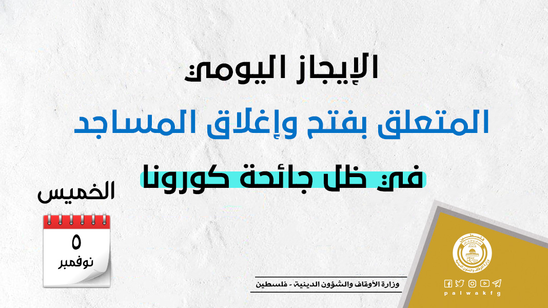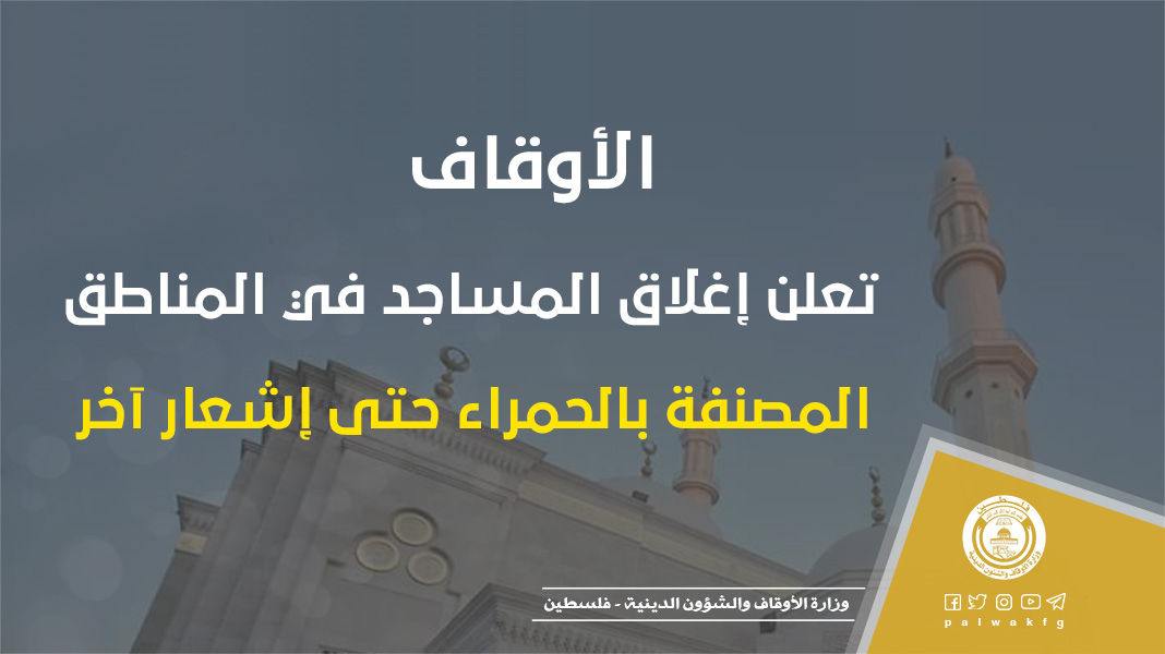 أعلنت وزارة الأوقاف والشؤون الدينية إعادة إغلاق كافة المساجد في المناطق المصنفة بالحمراء، اعتبارًا من فجر يوم غدٍ الجمعة الموافق 6 / 11 / 2020م وحتى إشعار آخر وذلك وفق تقديرات لجنة الطوارئ العليا والجهات المختصة في وزارة الصحة بعد ازدياد حالات الإصابة بفيروس كورونا ف تلك المناطق.