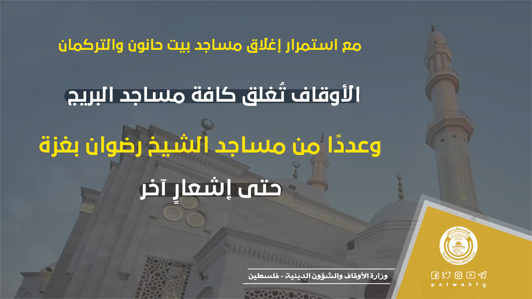 أعلنت وزارة الأوقاف والشؤون الدينية إغلاق جميع المساجد في البريج بالمحافظة الوسطى وعددًا من مساجد منطقة الشيخ رضوان بمدينة غزة، واستمرار إغلاق جميع المساجد في مدينة بيت حانون شمال القطاع ومنطقة التركمان بالشجاعية شرق غزة.
