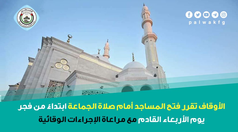 قررت وزارة الأوقاف والشؤون الدينية بغزة فتح المساجد أمام صلاة الجماعة ابتداءً من فجر يوم الأربعاء القادم الموافق 11/ شوال /1441هـ الموافق 3/يونيو/2020م. وأكد وكيل وزارة ال