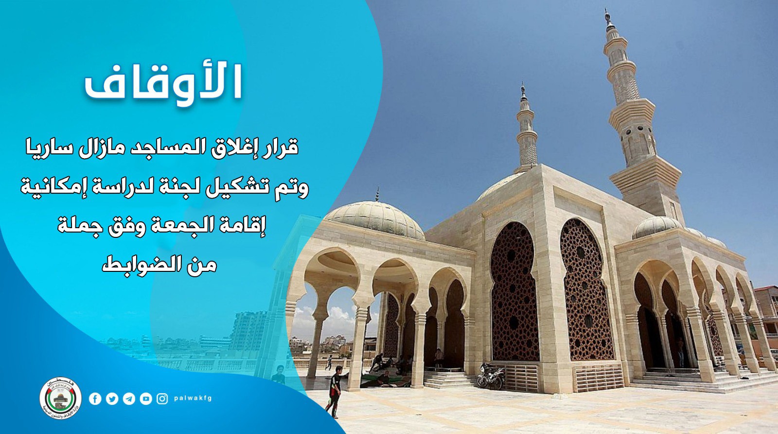 أكدت وزارة الأوقاف والشؤون الدينية أن قرارها القاضي بإغلاق المساجد وإيقاف إقامة صلاة الجمعة والجماعات فيها مازال ساريًا. وأوضحت الأوقاف أنه تم تشكيل لجنة حكومية مختصة من ا