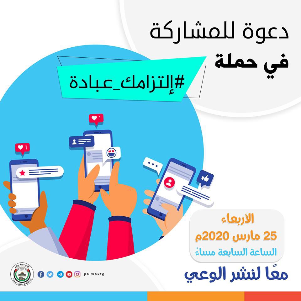 أعلنت وزارة الأوقاف والشئون الدينية عن إطلاق حملة بعنوان التزامك عبادة بالتعاون والتنسيق مع الإعلام الحكومي وشركاء آخرين اليوم الأربعاء الموافق 25/3/2020م, في تمام الساعة السابعة مساء, تتضمن الالتزام بالفتاوى الشرعية، بالقرارات الحكومية، بالإرشادات الو