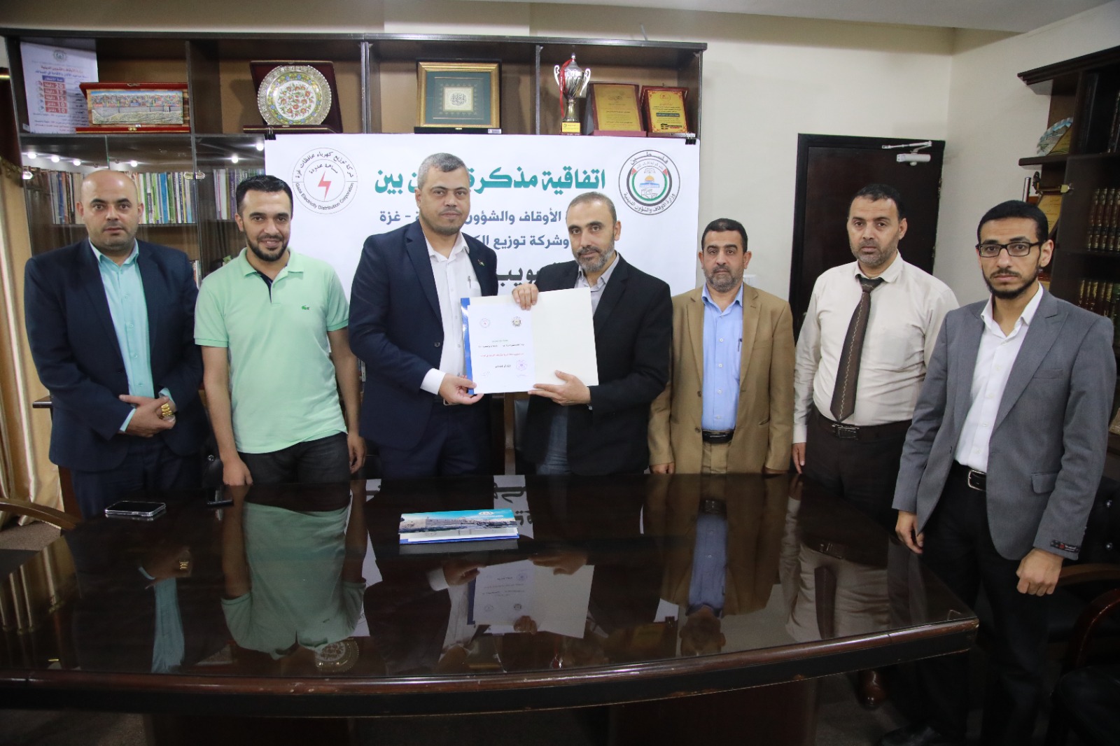 وقع وكيل وزارة الأوقاف والشؤون الدينية د. عبد الهادي الاغا مذكرة تفاهم مع رئيس هيئة المديرين بشركة توزيع الكهرباء – غزة د. خليل شقفة, لترتيب أوضاع اشتراكات كهرباء المساجد واستهلاكها.