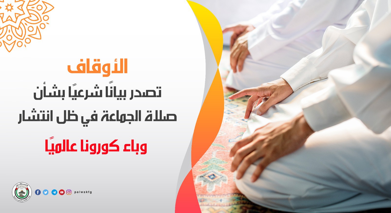 أصدرت وزارة الأوقاف والشئون الدينية بغزة بيانًا شرعيًا بشأن أداء صلاة الجماعة في ظل الانتشار العالمي لوباء كورونا، أكدت فيه أنه لا يجوز للمصابين بأعراض الانفلونزا والأمراض المعدية وكبار السن، وضعيفي المناعة حضور صلاة الجماع