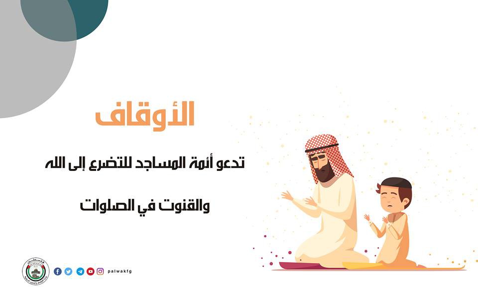 دعت وزارة الأوقاف والشئون الدينية بغزة الأئمة في المساجد كافة، إلى التضرع إلى الله تعالى والقنوت في الصلوات بأن يقي شعبنا وأمتنا والبشرية جمعاء من الأوبئة والأمراض، وأن يرفع البلاء ويحفظ العباد من وباء كورونا، وأن يشفي المرضى والمصابين. ونوهت ا