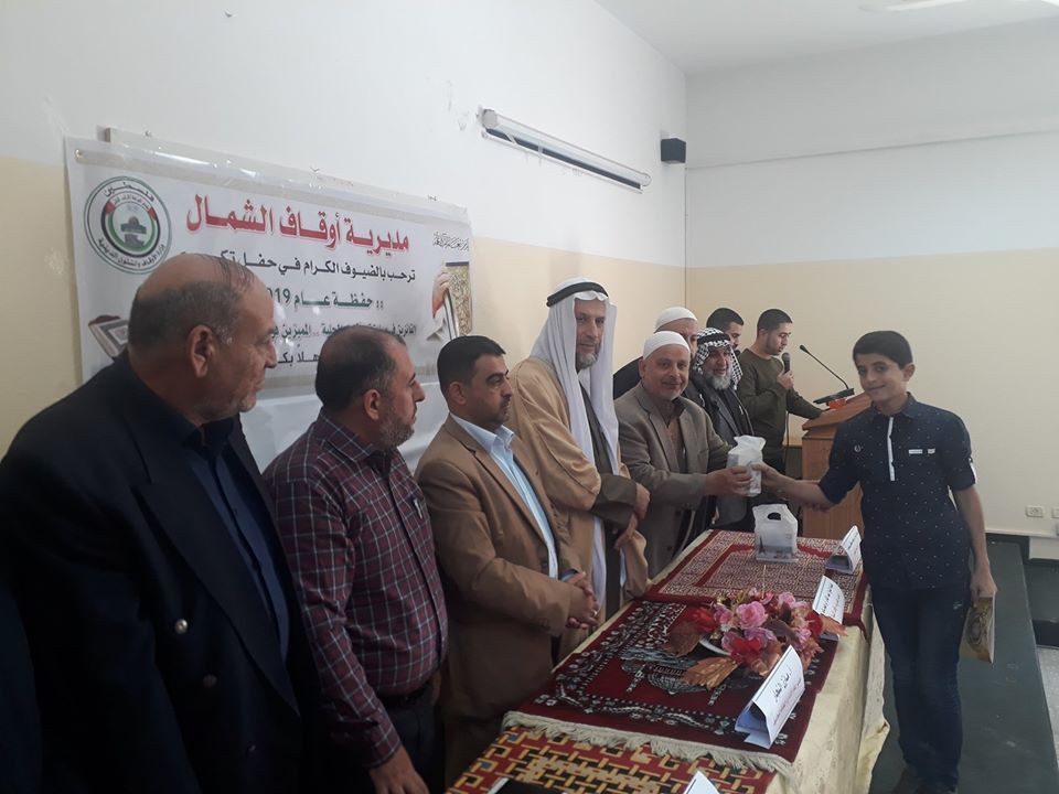كرم قسم التحفيظ بمديرية أوقاف الشمال الطلاب الحافظين للقرآن الكريم وأجزاء منه في قاعة المديرية بحضور مدير أوقاف الشمال الشيخ عبد القادر سالم وأ. مازن النجار مدير عام الادارة العامة للتحفيظ وأ. توفيق حماد رئيس قسم مراكز التحفيظ بالوزارة والشيخ ابراهيم ع