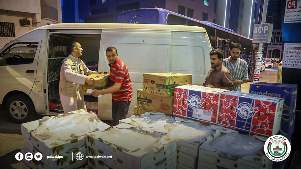 بعثة الحج الفلسطينية توزع وجبات غذائية وفواكه وتمور على حجاج القطاع