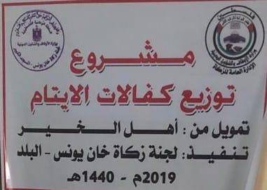 وزَّعت لجنة زكاة خان يونس البلد كفالات للأيتام عن شهر فبراير ومارس لعدد 10 أيتام , حيث سيتم توزيع الكفالة للأيتام بشكل شهري بواقع 150 شيكل لكل يتيم لمدة عام كامل بتمويل من المحسنين وأهل الخير . بدورهم أكَّد العاملون في اللجنة أن الهدف الرئيس من
