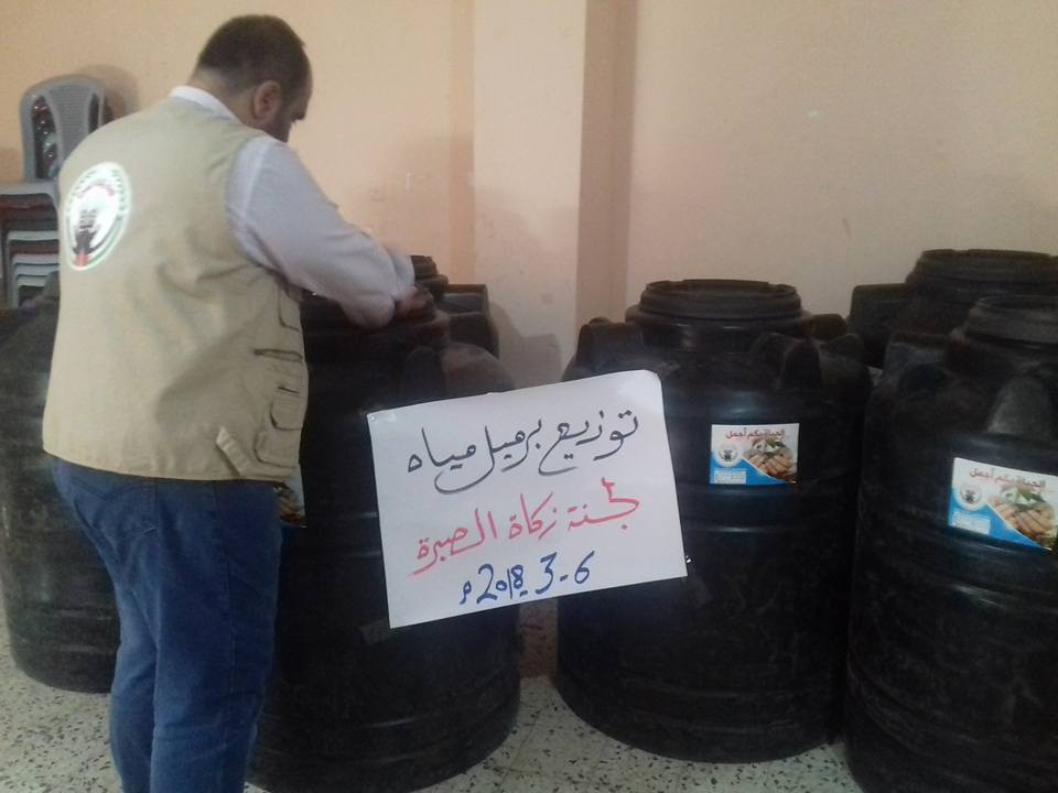 وزعت لجنة زكاة الصبرة "خزانات مياه "سعته 500 لتر على عدد عشرين اسرة فقيرة وذلك في اطار حملة ايد بايد الخير بزيد. وقد اطلقت لجنة زكاة الصبرة هذه الحملة من أجل التخفيف عن الفقراء والمحتاجين ورفع المعاناة عن شعبنا المحاصر ، مصداقا لقول رسولن