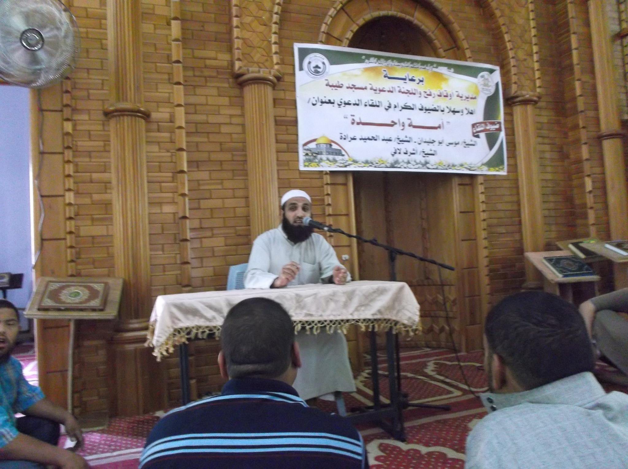 نفذت مديرية أوقاف رفح وبالتعاون مع اللجان الدعوية بمساجد طيبة وأبو بكر الصديق والهدى برفح، 3 أيام دعوية متتالية بعنوان أمة واحدة، حيث استضافت المديرية كل من الداعية منصور بريك، وحسام الجزار، ومحمود عيسى وبكر أبو حدايد وأكد ضيوف اللقاء على ضرورة