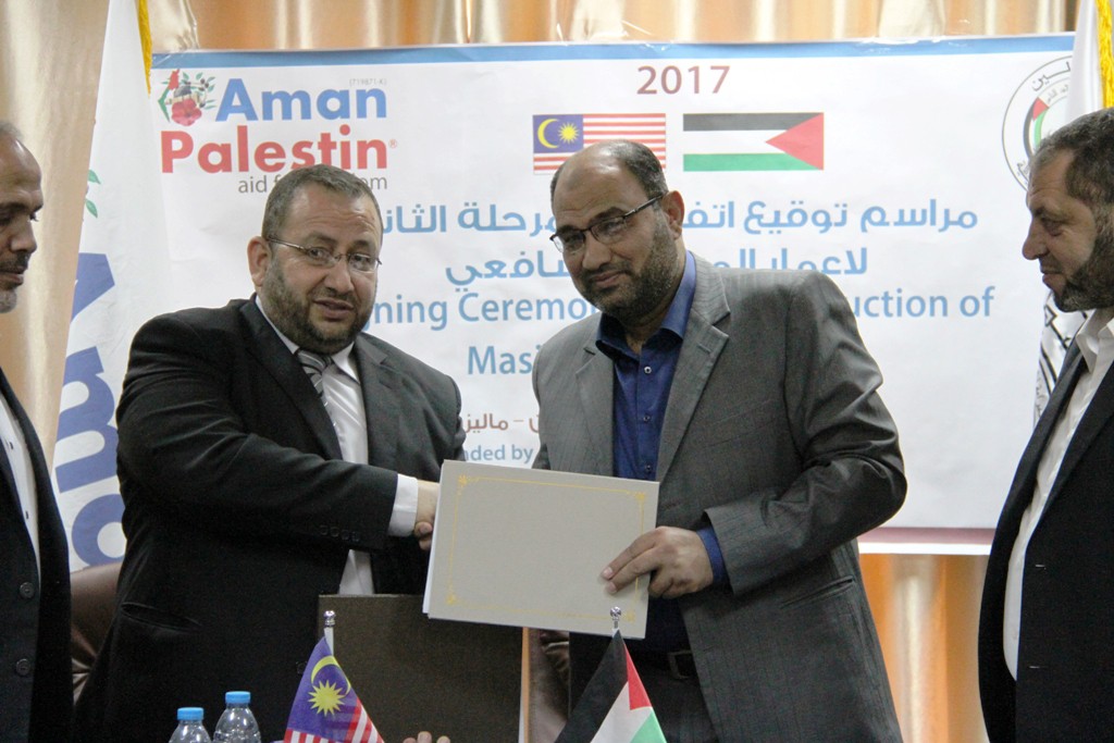 وقعت وزارة الأوقاف والشئون الدينية يُمثلها وكيلها د. حسن الصيفي ومؤسسة أمان فلسطين – ماليزيا ويُمثلها مدير المكتب التنفيذي بفلسطين م. عمر صيام، اتفاقية للبدء بالمرحلة الثانية من إعمار مسجد الشافعي بحي الزيتون في مدينة غزة، وذلك بحضور رئيس لجنة إع