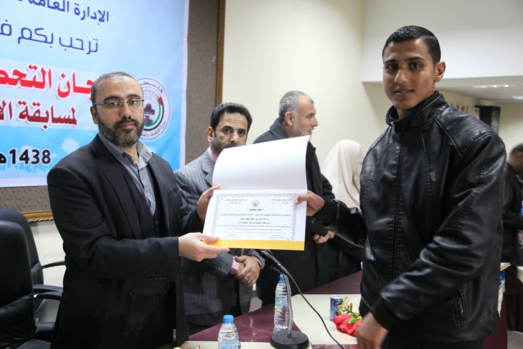 كرمت الإدارة العامة للتحفيظ التابعة لوزارة الأوقاف والشئون الدينية لجان التحكيم والاختبارات لمسابقة الأقصى المحلية, وذلك خلال حفل نظمته في قاعة القدس بمقر الوزارة, بحضور مشاركة وكيل الوزارة د. حسن الصيفي ومدير عام التحفيظ أ. عبد الهادي الأغا ولفيف من م