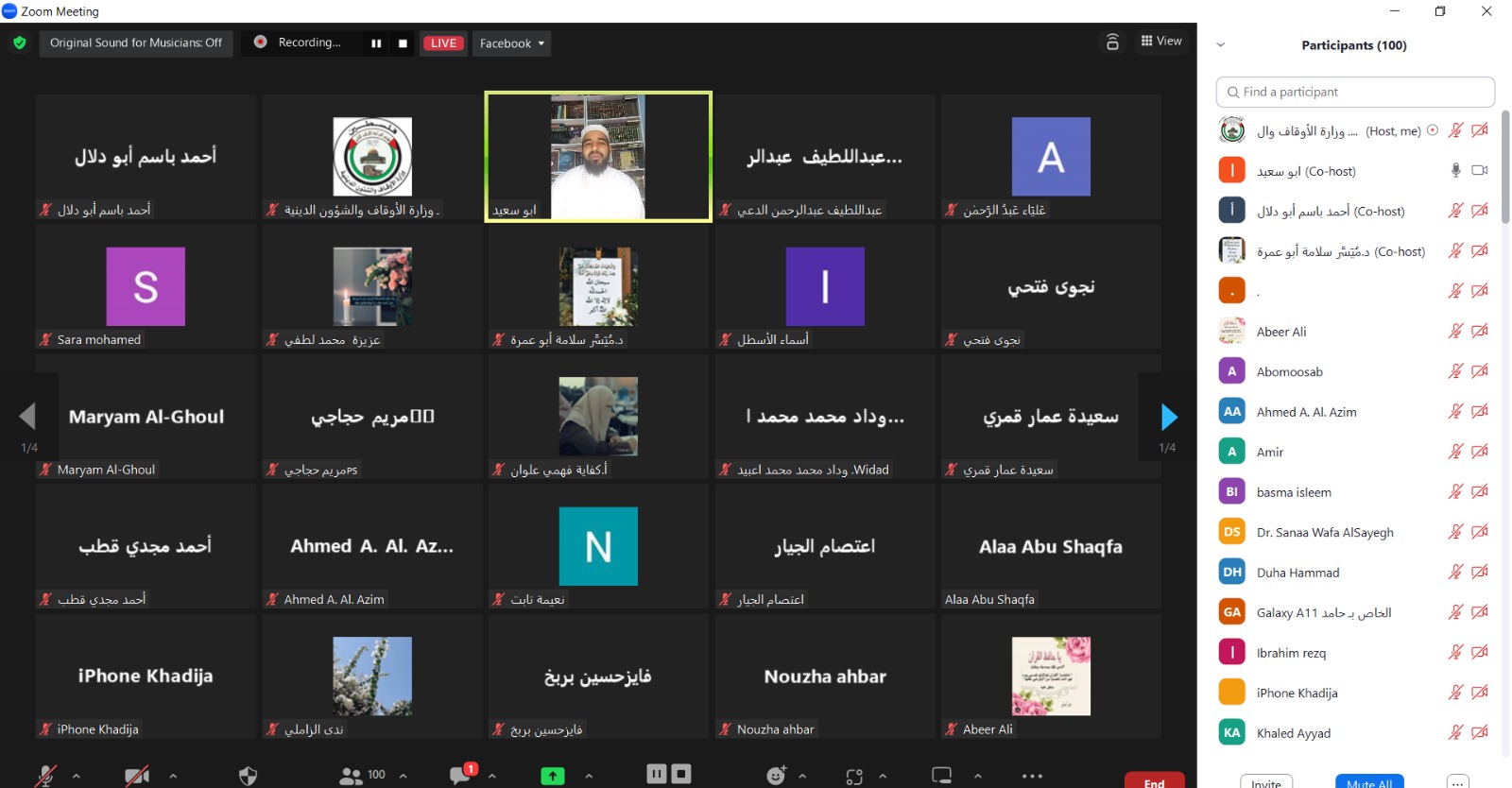نفّذت الدائرة العلميّة بوحدة التعليم الشرعيّ في وزارة الأوقاف والشؤون الدينيّة محاضرة علميّة بعنوان: (مقوّمات بناء طالب العلم في مواجهة تحديات العصر)، عبر تطبيق الزوم، استهدفت 150 من طلبة العلم الشرعيّ والدعاة داخل فلسطين وخارجها، بواقع ساعتين تدريسيّتين.