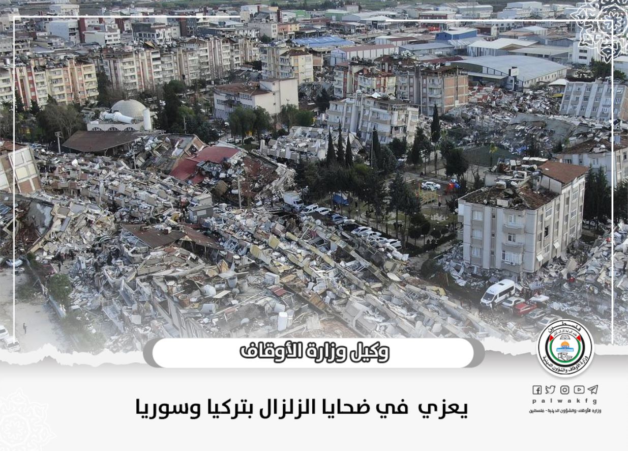 قدّم وكيل وزارة الأوقاف والشؤون الدينية د. عبد الهادي الأغا خالص التعازي والمواساة لمعالي الدكتور علي أرباش رئيس رئاسة الشؤون الدينية التركية، وللحكومة والشعب التركي، بضحايا الزلزال الكارثي الذي تعرضت له منطقة إقليم قهرمان مرعش، ومناطق أخرى من الجمهورية التركية، موديًا بآلاف الضحايا والمصابين.