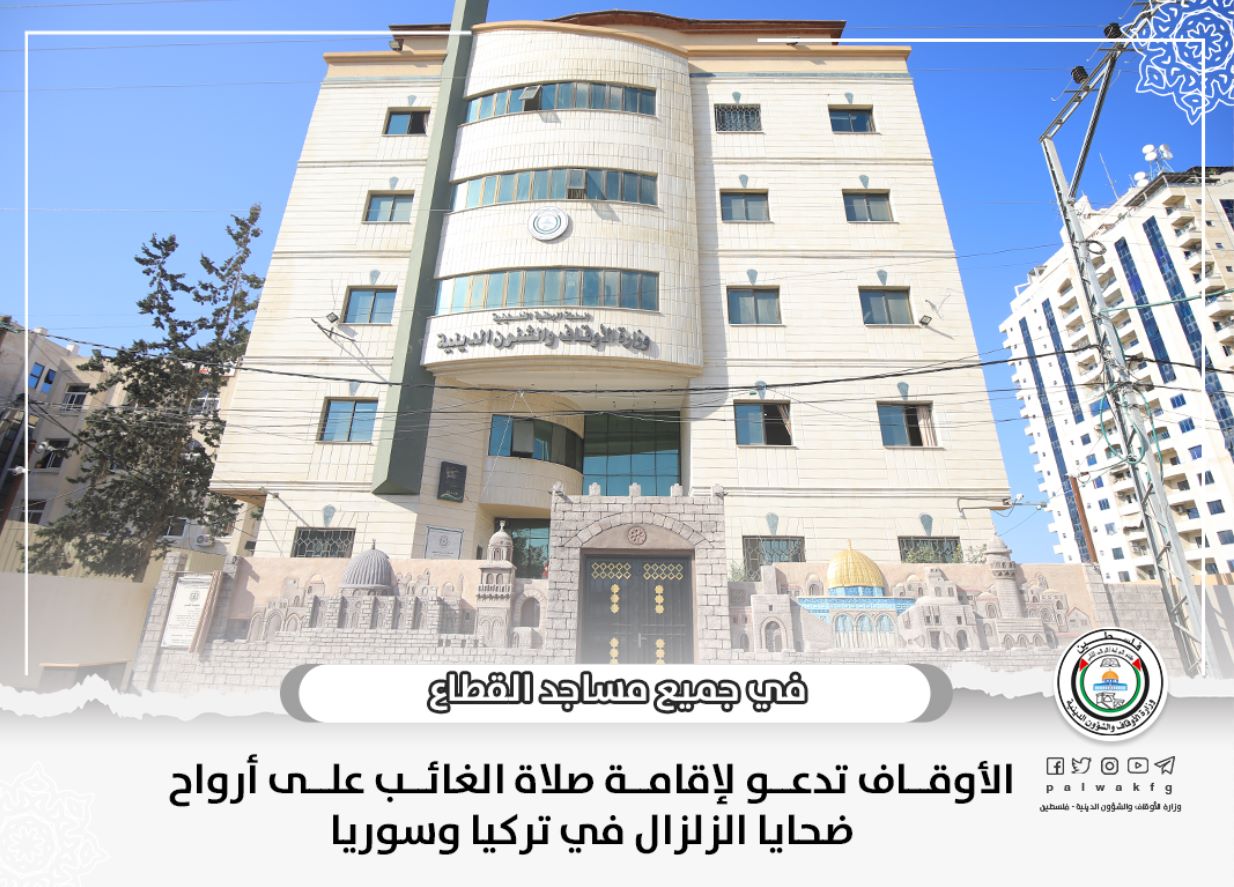 دعت وزارة الأوقاف والشؤون الدينية أئمة المساجد والخطباء في جميع مساجد محافظات قطاع غزة إلى إقامة صلاة الغائب بعد صلاة الجمعة عن أرواح ضحايا الزلزال الكارثي في سوريا وتركيا، والتضرع إلى الله سبحانه وتعالى أن يدفع السوء والكوارث عن كل بلاد المسلمين والعالم.