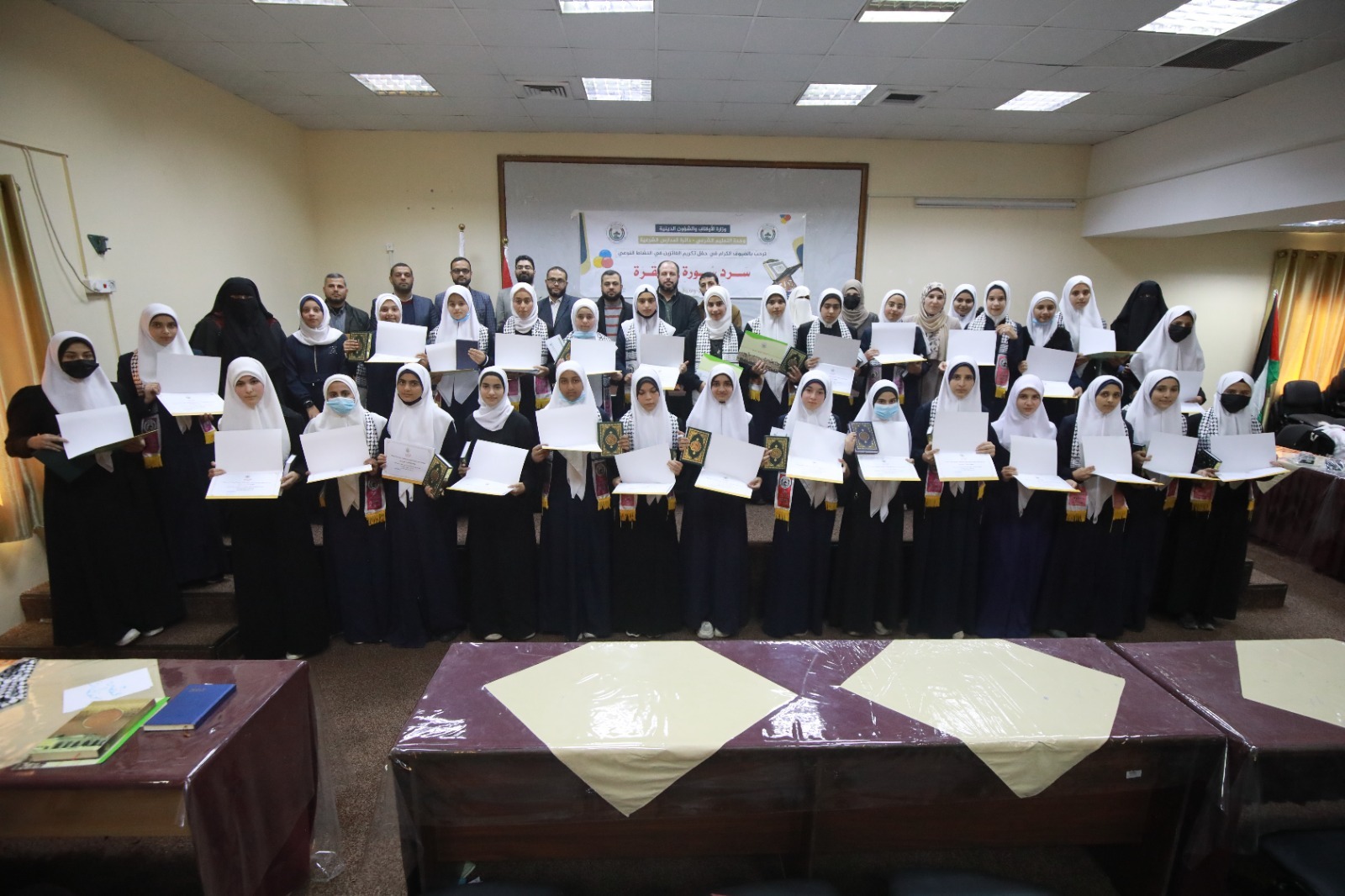 كرّمت دائرة مدارس الأوقاف الشرعيّة 60 طالبًا وطالبة ممّن سردوا سورة البقرة على جلسة واحدة، وذلك خلال حفل نظّمته في قاعة القدس بمقر الوزارة، والذي يأتي في إطار الارتقاء بملف القرآن الكريم داخل المدارس.