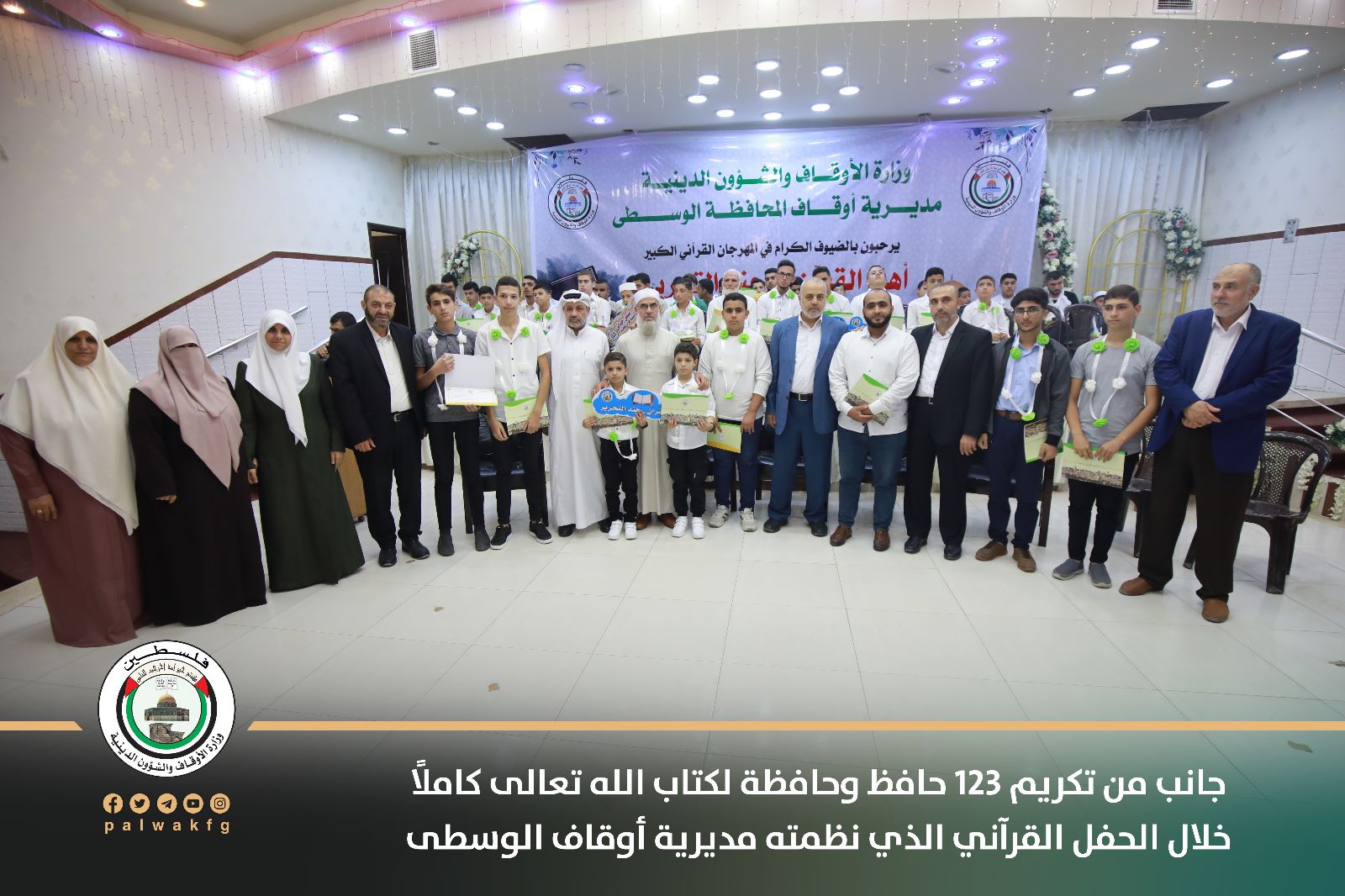 كرّمت مديرية أوقاف الوسطى 123 حافظ وحافظة لكتاب الله تعالى خلال العام 1444هـ/2022م، في حفل قرآني كبير نظمته في صالة المصدر وسط المحافظة بعنوان "أهل القرآن جند التحرير".