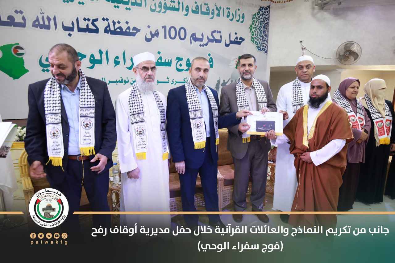 كرمت مديرية أوقاف رفح 100 حافظًا وحافظةً لكتاب الله تعالي، أتموا حفظ القرآن الكريم خلال العام الحالي 1444هـ/2022م، وذلك خلال حفل مهيب نظمته بعنوان "سفراء الوحي" في قاعة قصر الملكة وسط المحافظة، برعاية كريمة من جمعية البركة الجزائرية للعمل الخيري والإنساني.