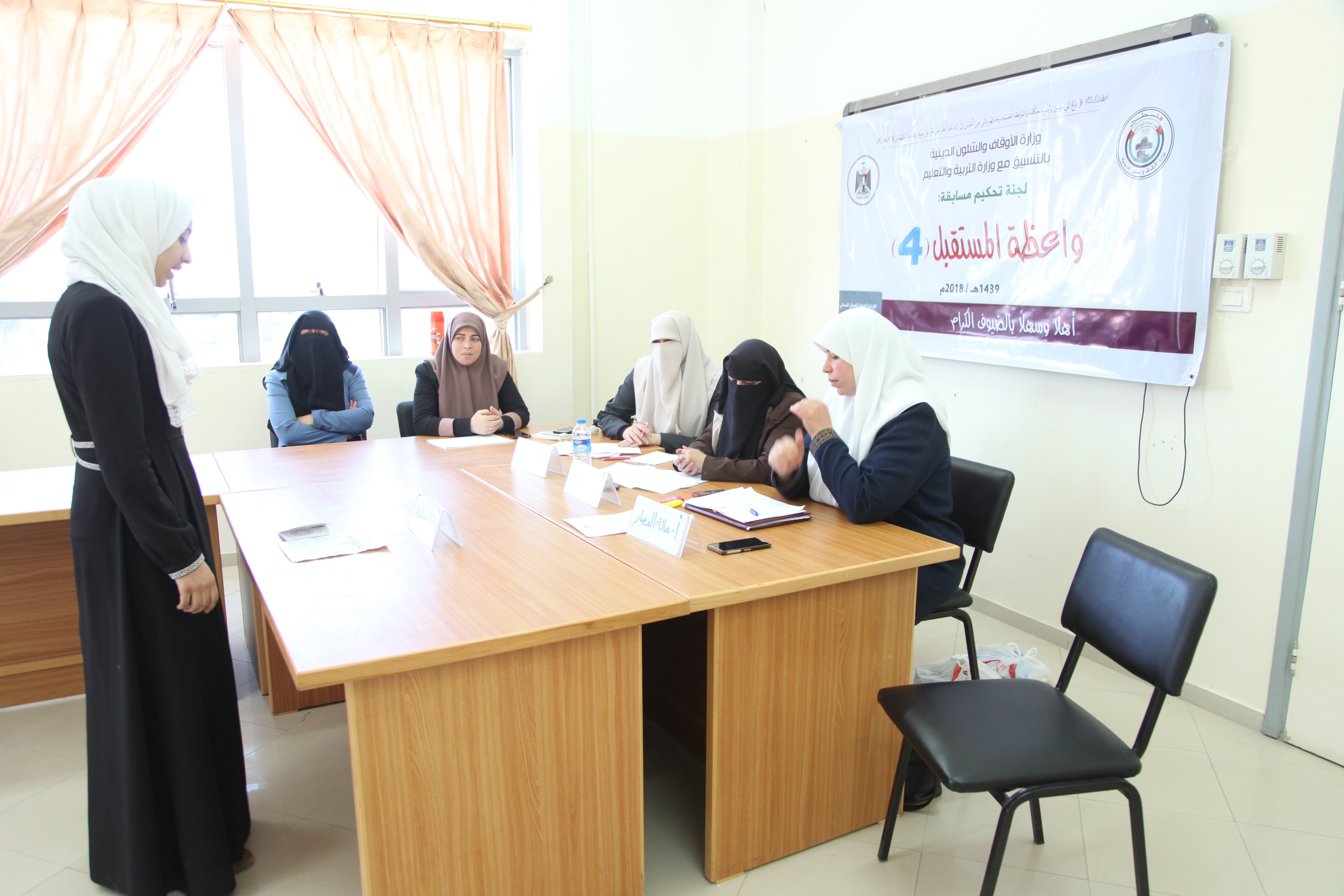 جاء ذلك خلال لجنة التحكيم نفذتها الإدارة العامة للعمل النسائي بوزارة الاوقاف والشئون الدينية بالتنسيق مع وزارة التربية والتعليم ، استهدفت الطالبات المشاركات في مسابقة واعظة المستقبل الرابع البالغ عددهن 350 طالبة من المرحلة الثانوية موزعة على سبع مديريات ، حيث اشتملت المسابقة على ثلاثة محاور رئيسة وهي :"القدس والأقصى والتكافل والتراحم والحجاب".