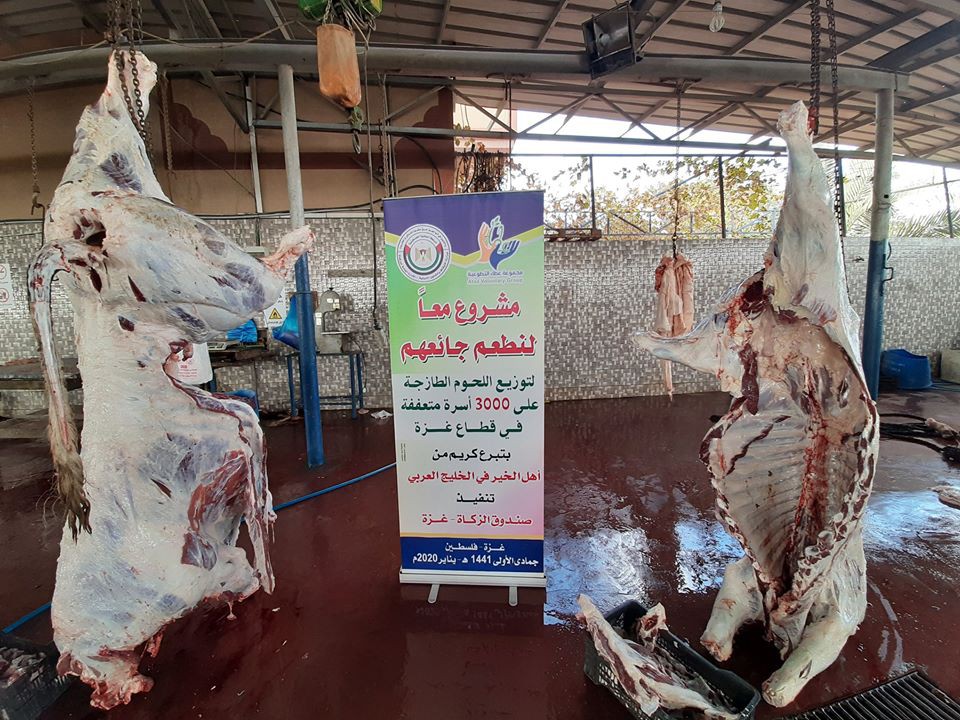 أنهت الادارة العامة للزكاة التابعة لوزارة الأوقاف والشئون الدينية مشروع (معاً لنطعم جائعهم ) ، بتوزيع اللحوم الطازجة علي ( 3000 ) أسرة فقيرة في قطاع غزة وذلك خلال شهر يناير 2020 ، بتمويل كريم من مجموعة عطاء التطوعية .