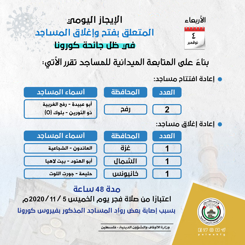 أعلنت وزارة الأوقاف والشؤون الدينية إغلاق 3 مساجد مدة 48 ساعة في غزة والشمال وخانيونس بسبب اكتشاف حالات إصابة بفيروس كورونا لدى بعض روادها، وعدم التزام بعضها بالإجراءات الوقائية.