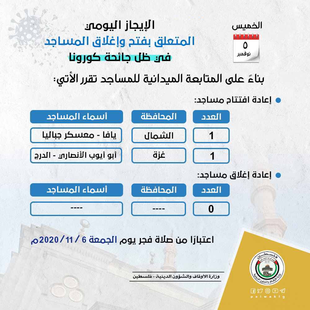 أعلنت وزارة الأوقاف والشؤون الدينية إعادة افتتاح مسجدين في محافظتي غزة والشمال بعد انتهاء مدة 48 ساعة على إغلاقهما.