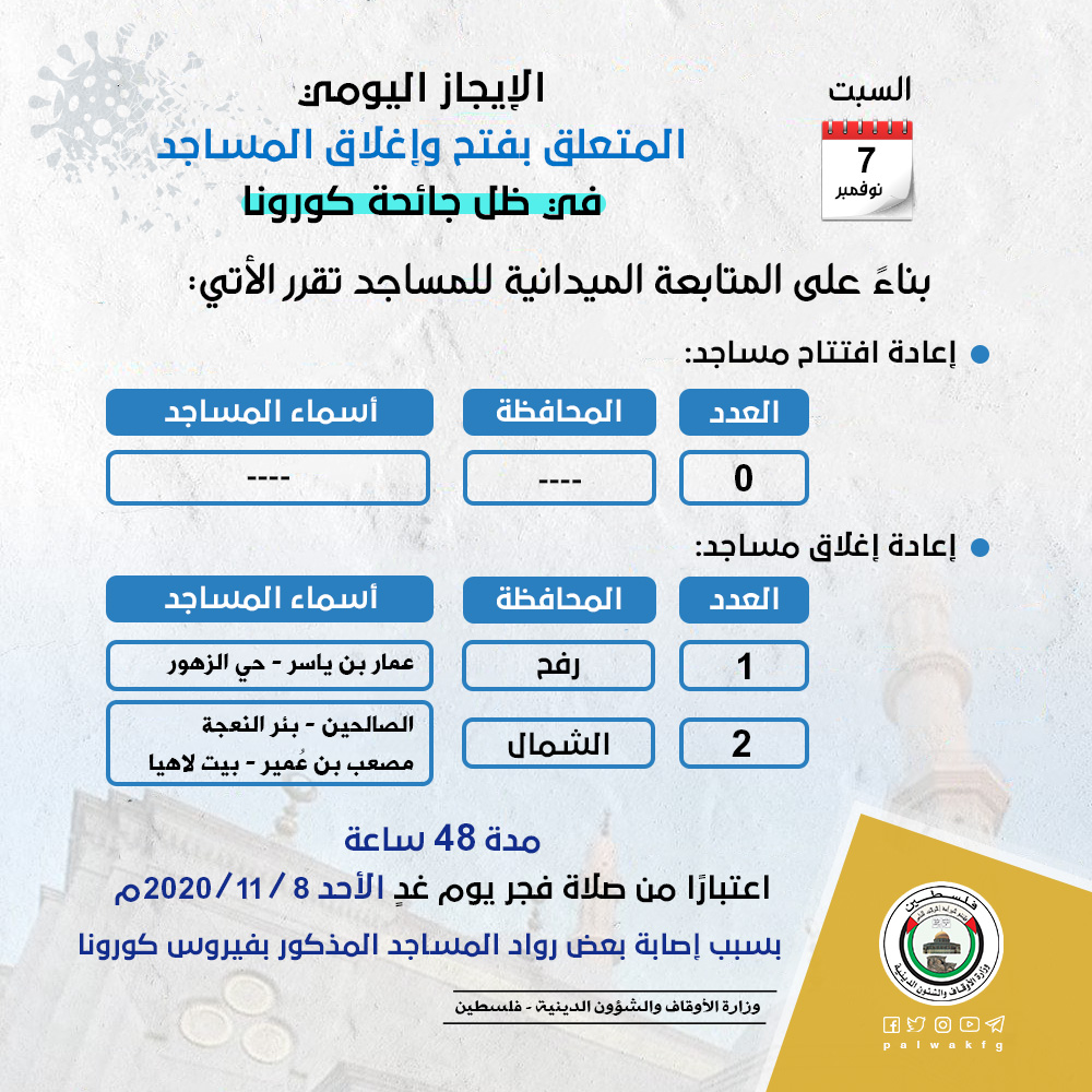 أعلنت وزارة الأوقاف والشؤون الدينية إغلاق 3 مساجد في محافظتي رفح والشمال مدة 48 ساعة بسبب اكتشاف حالات إصابة بفيروس كورونا لدى بعض روادها وذلك اعتبارًا من صلاة فجر يوم غدٍ الأحد الموافق 8/11/2020م.