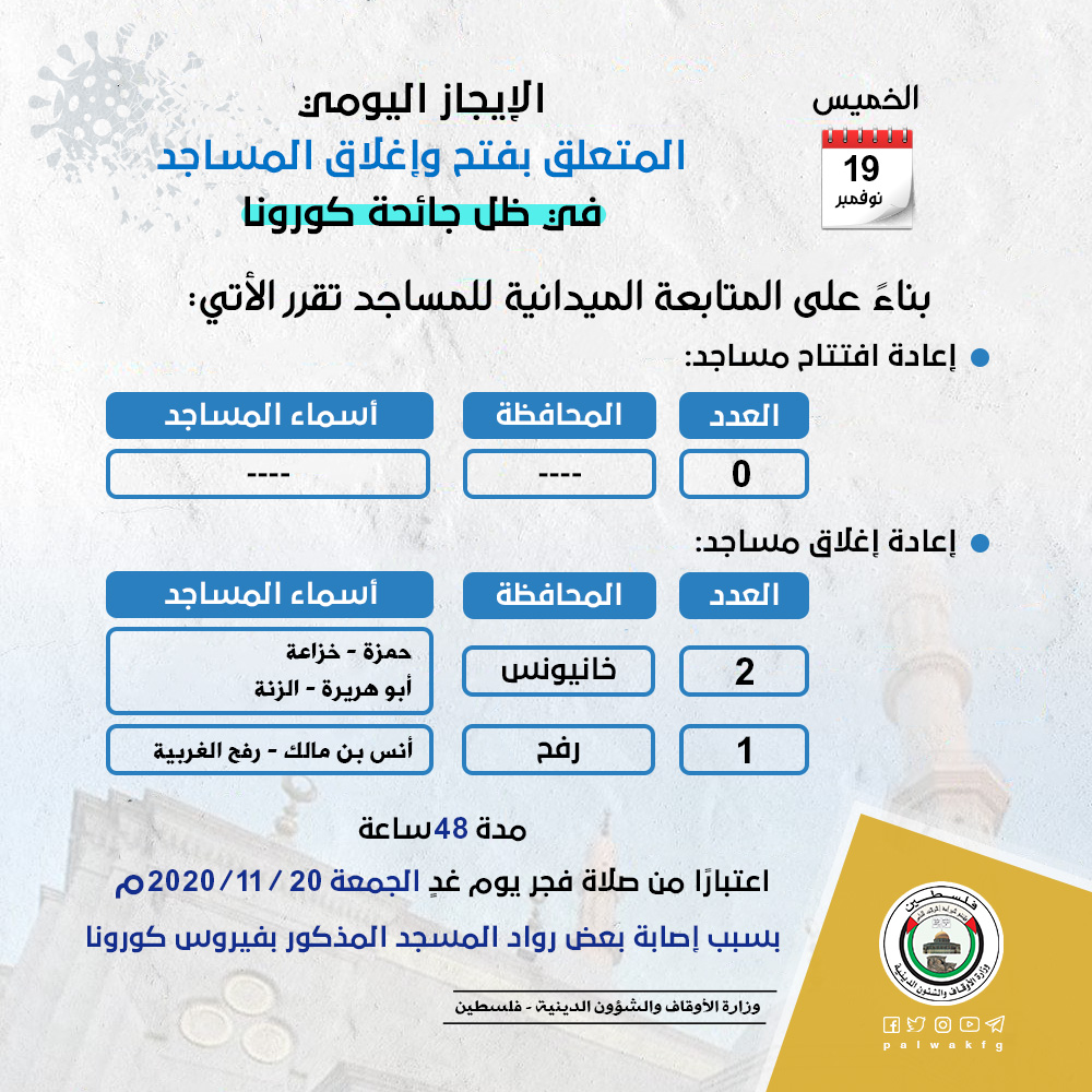 أعلنت وزارة الأوقاف والشؤون الدينية بغزة إغلاق مسجدين في محافظة خانيونس ومسجدًا في محافظة رفح مدة 48 ساعة بسبب إصابة بعض روادها بكورونا