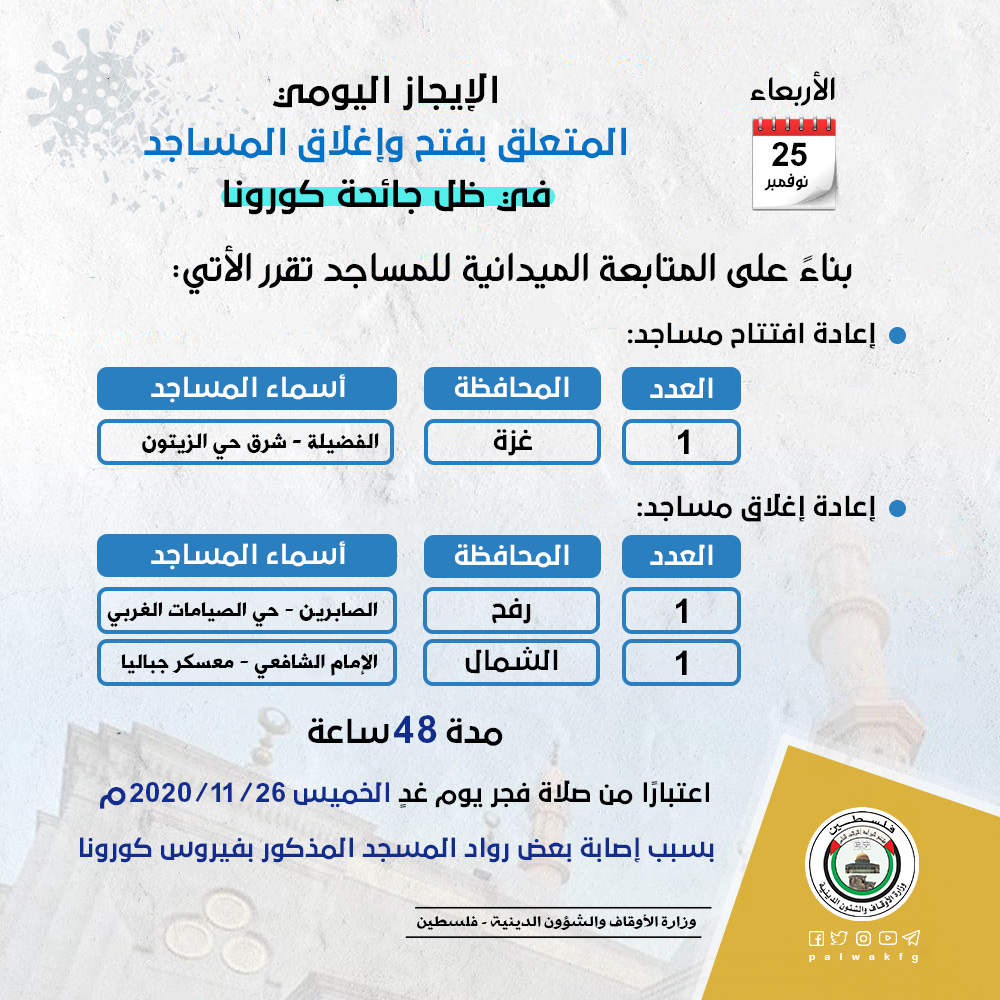 أعلنت وزارة الأوقاف والشؤون الدينية عن إغلاق مسجد الصابرين بحي الصيامات الغربي بمحافظة رفح، ومسجد الإمام الشافعي الواقع في معسكر جباليا شارع السكة بمحافظة الشمال وذلك اعتبارًا من صلاة فجر يوم غدٍ الخميس الموافق 26 / 11 / 2020م بسبب إصابة بعض رواد المسجدين بفيروس كورونا.