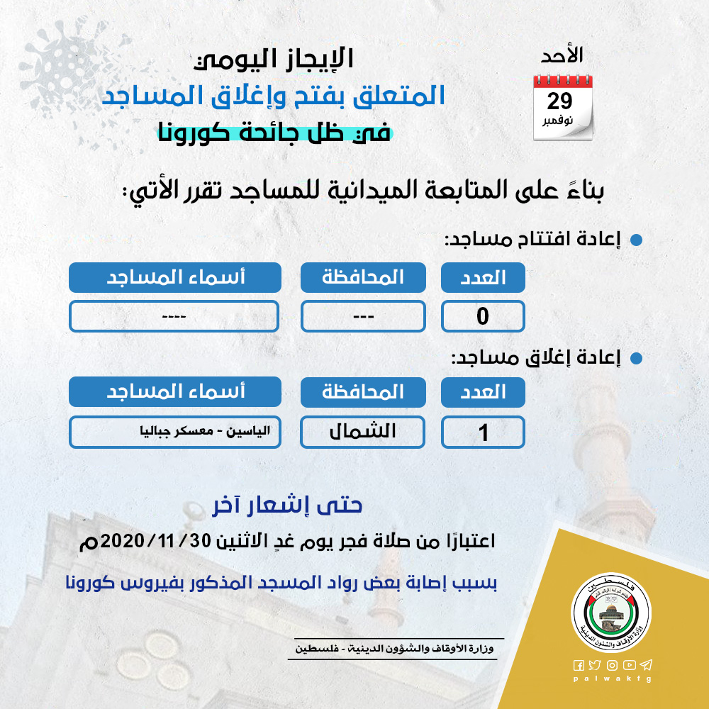 أعلنت وزارة الأوقاف والشؤون الدينية عن إغلاق مسجد الياسين الواقع في معسكر جباليا بمحافظة الشمال حتى إشعار آخر اعتبارًا من صلاة فجر يوم غدٍ الاثنين الموافق 30 / 11 / 2020م بسبب إصابة بعض رواده بفيروس كورونا.