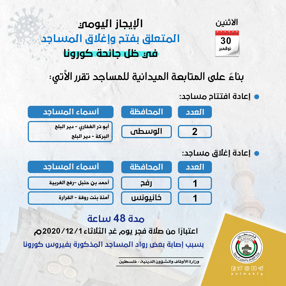 أعلنت وزارة الأوقاف والشؤون الدينية عن إغلاق مسجدين بمحافظتي رفح وخانيونس مدة 48 ساعة اعتبارًا من صلاة فجر يوم غدٍ الثلاثاء الموافق 1 / 12 / 2020م بسبب إصابة بعض روادها بفيروس كورونا.