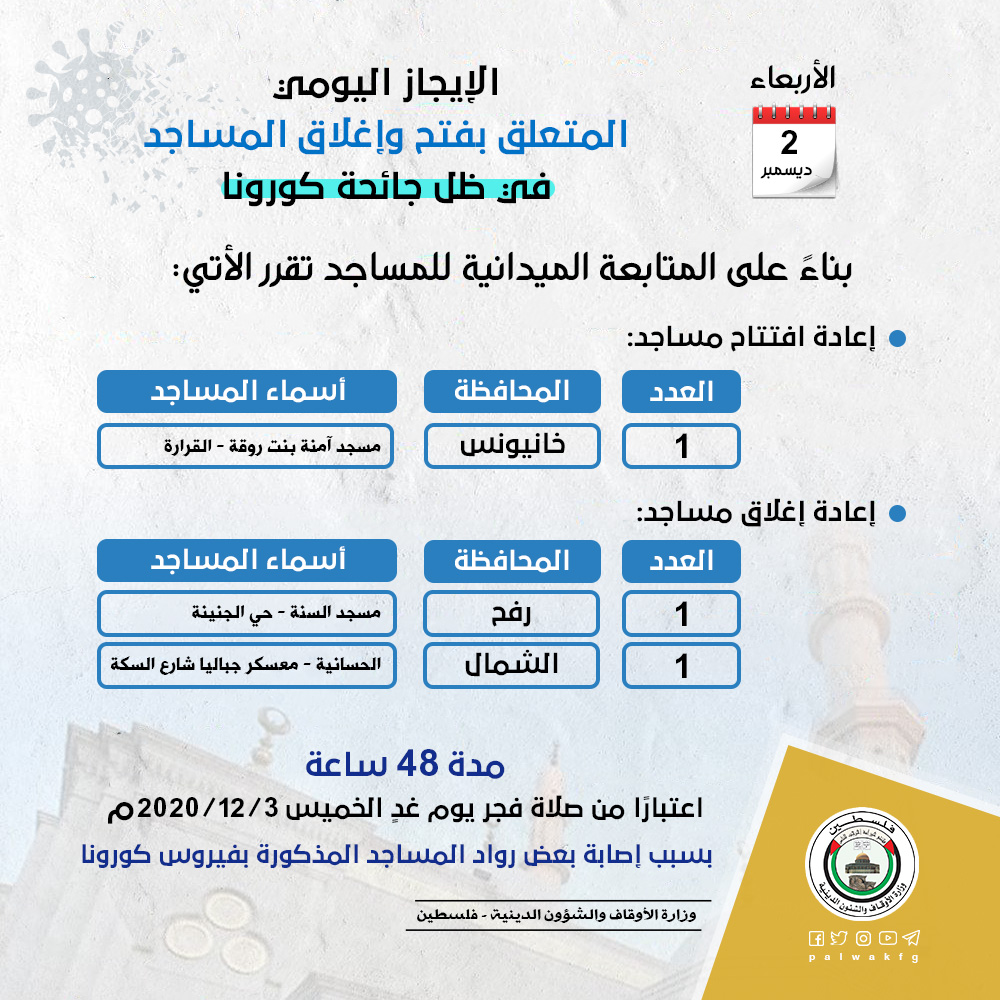 بناءً على المتابعة الميدانية للمساجد تقرر إغلاق مسجد السنة بحي الجنينة في محافظة رفح، ومسجد الحساينة بمعسكر جباليا شارع السكة في محافظة الشمال، مدة 48 ساعة اعتبارًا من صلاة فجر يوم غدٍ الخميس الموافق 3 / 12 / 2020م بسبب إصابة بعض روادها بفيروس كورونا.