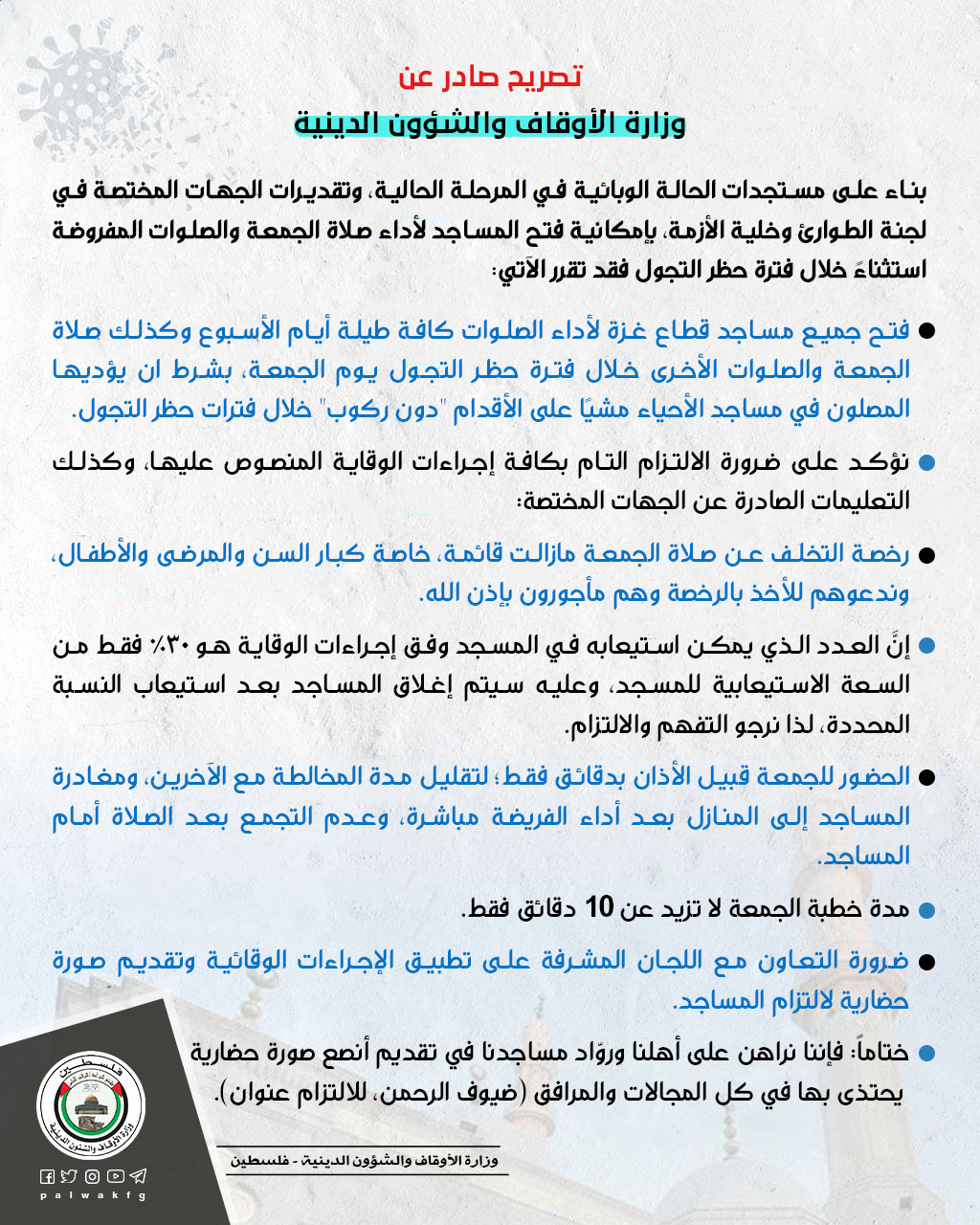 بناء على مستجدات الحالة الوبائية في المرحلة الحالية، وتقديرات الجهات المختصة في لجنة الطوارئ وخلية الأزمة، بإمكانية فتح المساجد لأداء صلاة الجمعة والصلوات المفروضة استثناءً خلال فترة حظر التجول فقد تقرر الآتي: