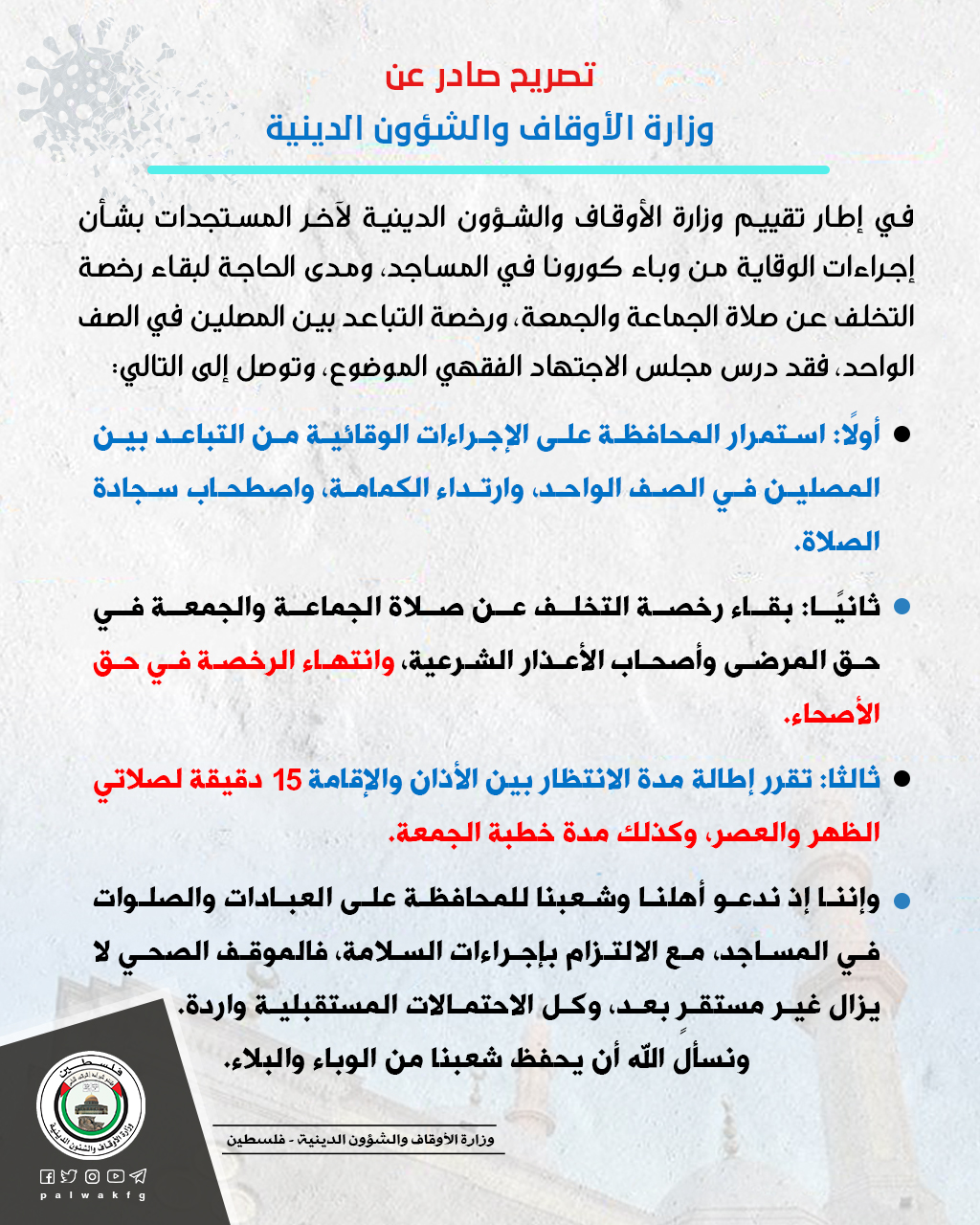 أولًا: استمرار المحافظة على الإجراءات الوقائية من التباعد بين المصلين في الصف الواحد، وارتداء الكمامة، واصطحاب سجادة الصلاة.