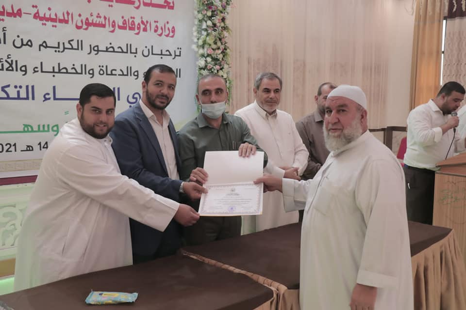 كرمت مديرية أوقاف الشمال علماء ودعاة وأئمة وخطباء المحافظة, وذلك خلال حفل نظمته تحت رعاية جمعية الفلاح الخيرية, بحضور وكيل الوزارة د. عبدالهادي الأغا, ومدير عام المديريات أ. منذر الغماري, ومدير المديرية د. مرسي سلمان, ورئيس جمعية الفلاح أ. محسن طنبورة.