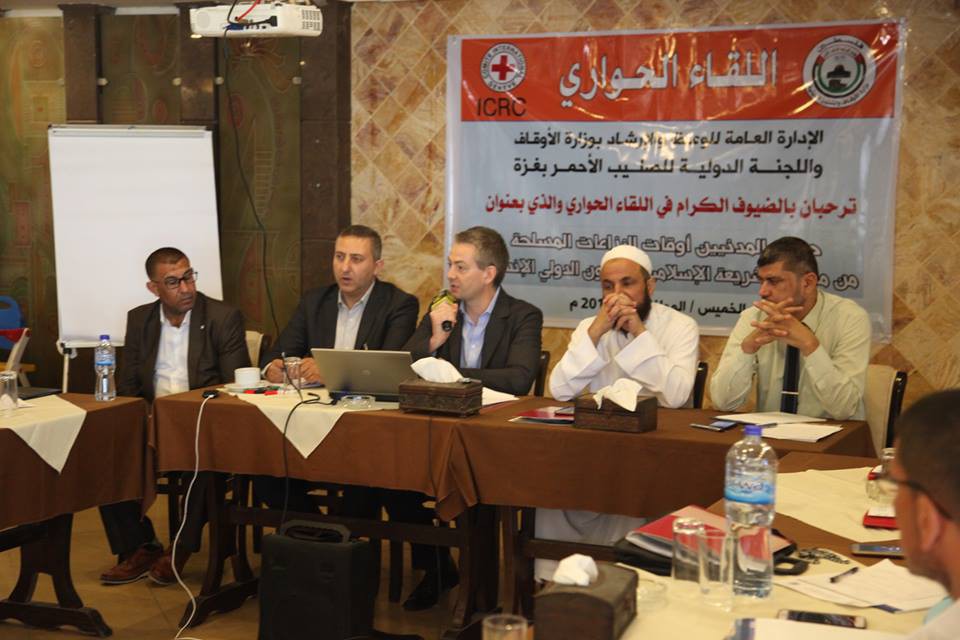 نظمت وزارة الأوقاف والشئون الدينة بالتعاون مع اللجنة الدولية للصليب الأحمر بغزة لقاءً حوارياً بعنوان: "حماية المدنيين أوقات النزاعات المسلحة من منظور الشريعة الإسلامية والقانون الدولي الإنساني" بحضور ومشاركة مدير عام الوعظ والإرشاد د. يوسف فرحات ومدير الوعظ د. محمد سالم، والسيد جيلان ديفورن، مدير بعثة الصليب الأحمر في قطاع غزة وأ. يوسف اليازجي المسؤول الإعلامي في الصليب الأحمر.