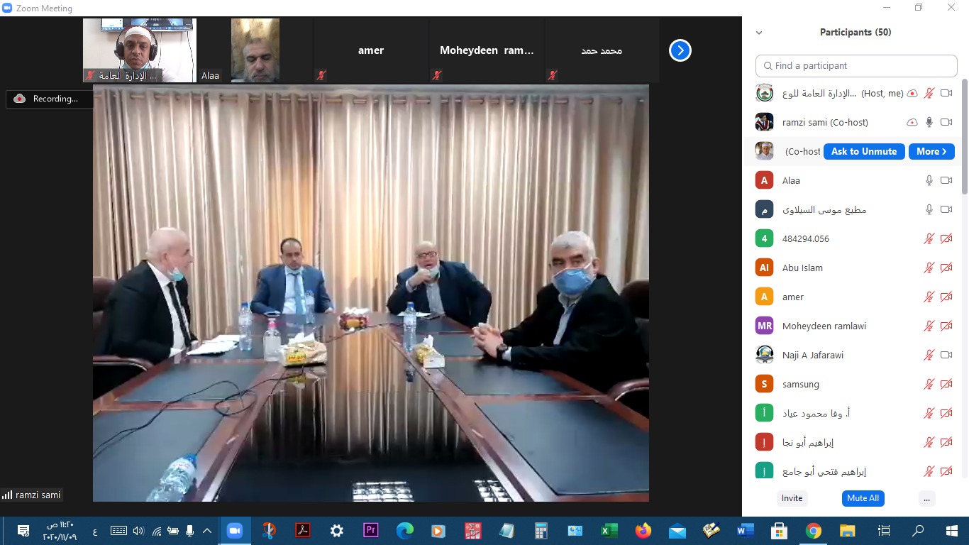 عقدت الإدارة العامة للوعظ والإرشاد بوزارة الأوقاف والشئون الدينية, لقاءً إلكترونيا عبر برنامج zoom, بعنوان " (قراءة تحليلية لزيادة عدد الإصابات بفايروس كورونا ومؤشرات ذلك ، والمعنى الحقيقي للتعايش", وذلك بالتعاون مع وزارة الصحة الفلسطينية.