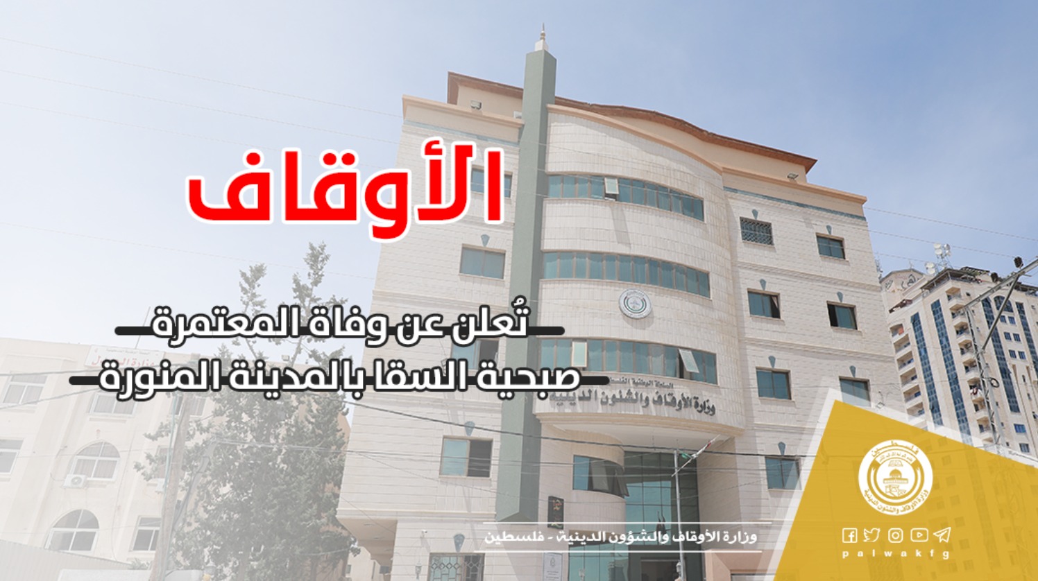 أعلنت وزارة الأوقاف والشؤون الدينية اليوم الثلاثاء، الموافق 22/3/2022م, عن وفاة المعتمرة صبحيه مصطفى محمد السقا (75عاما) من سكان مدينة خان يونس جنوب قطاع غزة, والتي خرجت أمس مع الفوج الثاني للمعتمرين.