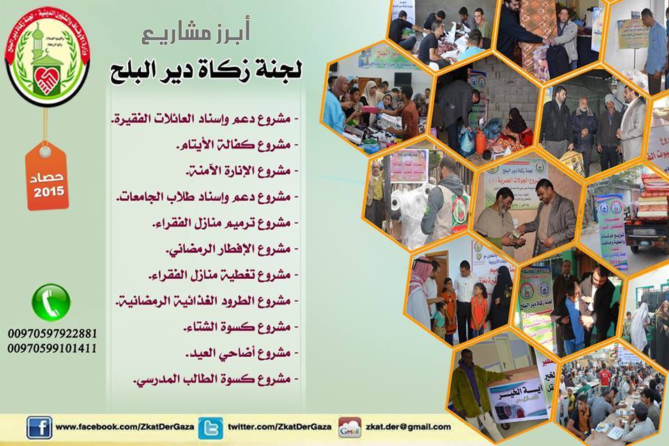 نفَّذت لجنة زكاة دير البلح التابعة للإدارة العامة للزكاة بوزارة الأوقاف والشئون الدينية سلسلة من المشاريع الخيرية خلال عام 2015 م استهدفت الآلاف من الفقراء والمحتاجين في المنطقة والتي تتمثل في إحدى عشرة مشروعا ، بهدف المساهمة في الحد من الفقر و